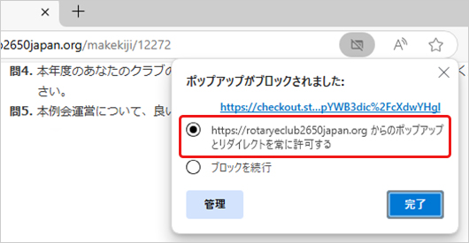 ブラウザのポップアップ設定で、当サイトのポップアップを常に許可するよう設定をしてください。